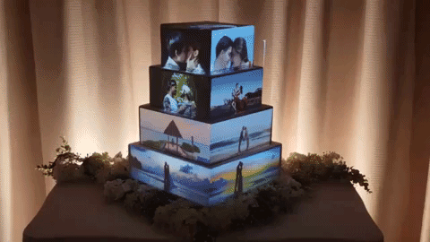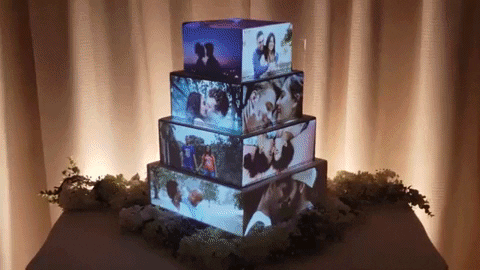 Choose any unique hashtag for your wedding, and have all your guests’ photos appear on your cake live! If you have a photo-booth setup at the reception, all the fun pics can display right on your interactive cake!